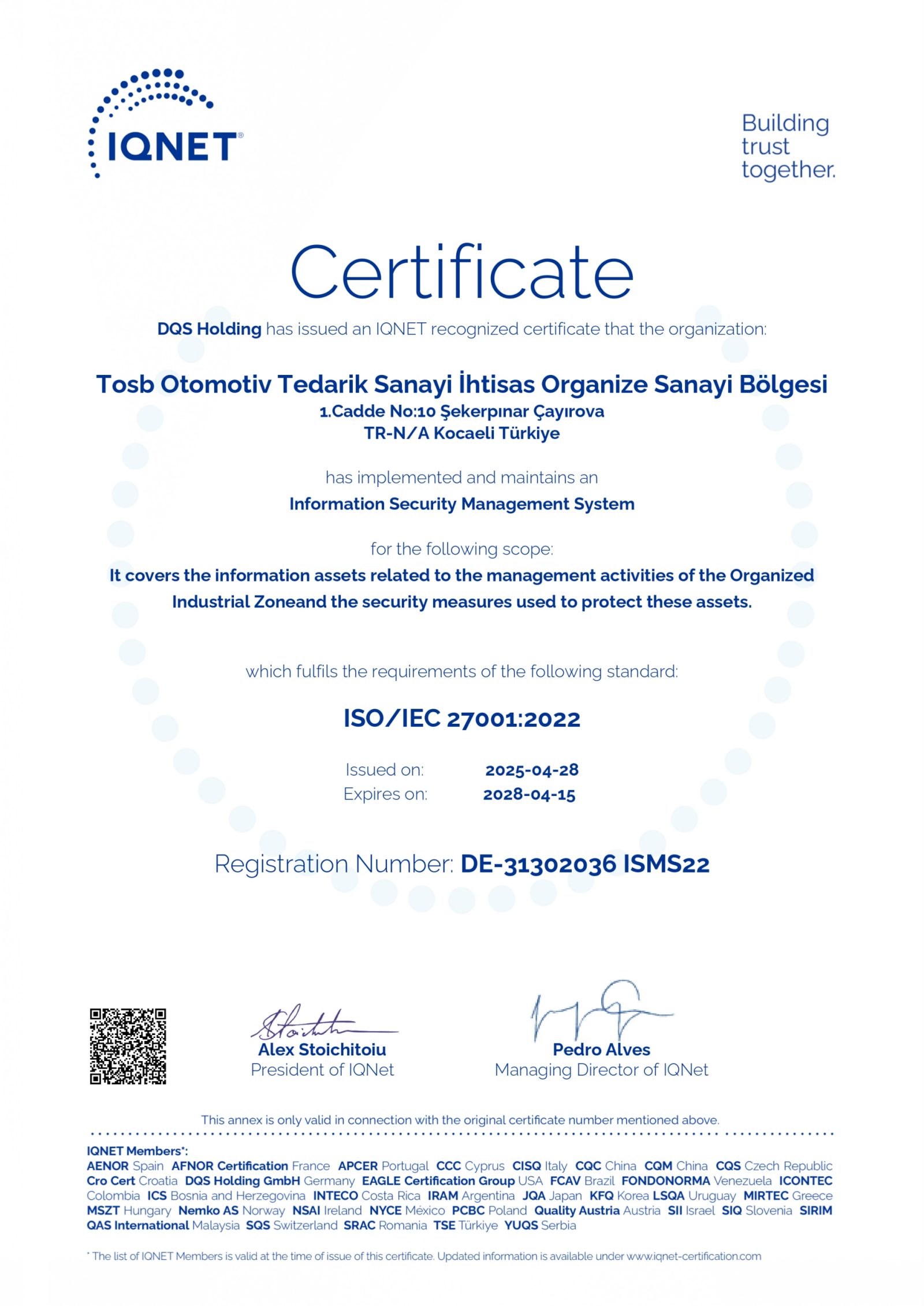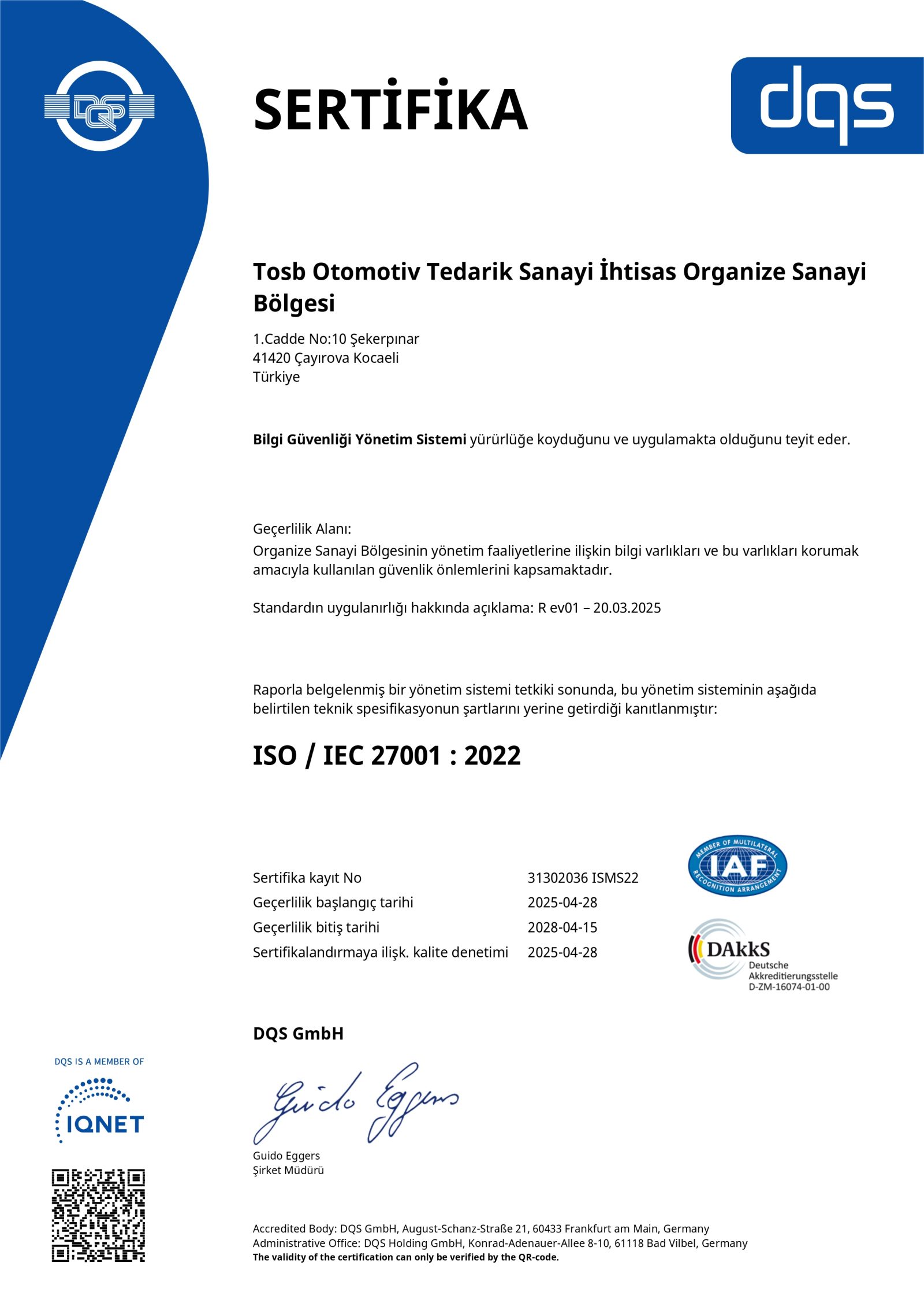 TOSB, korumakla yükümlü olduğu bilgilerin gizliliğinin, bütünlüğünün ve erişebilirliğinin gerektiği şekilde sağlanması amacıyla TS ISO/IEC 27001 Standartlarına uygun şekilde;